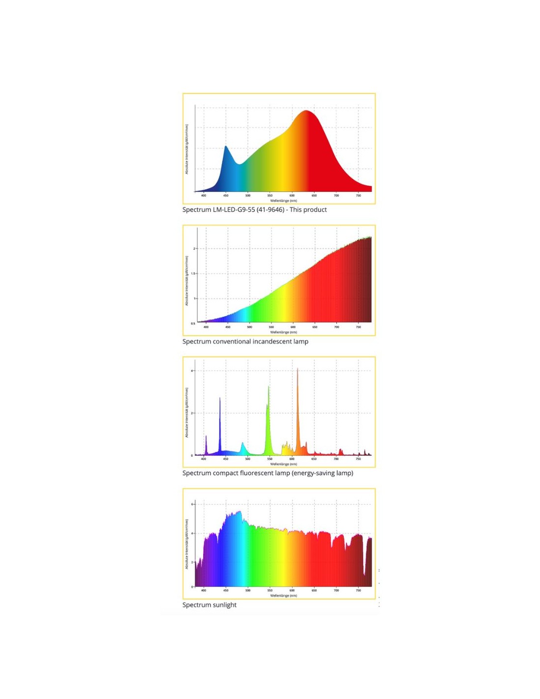 Grâce à son spectre quasi-continu, cette LED reproduit fidèlement la lumière des ampoules à incandescence ou halogènes, mais sans rayonnement thermique (IR ou infrarouge).