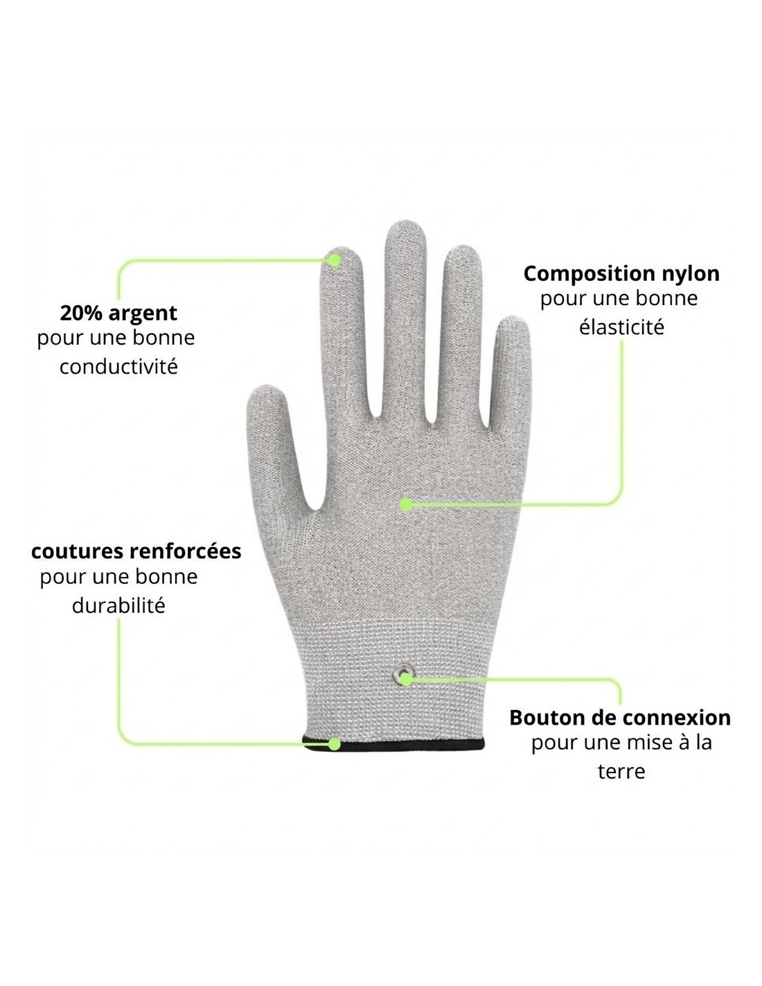 La connexion à une prise de terre fonctionnelle via le cordon adapté est indispensable pour qUe les gants assurent une continuité électrique entre le corps et la terre, selon le principe de la mise à la terre (Earthing).