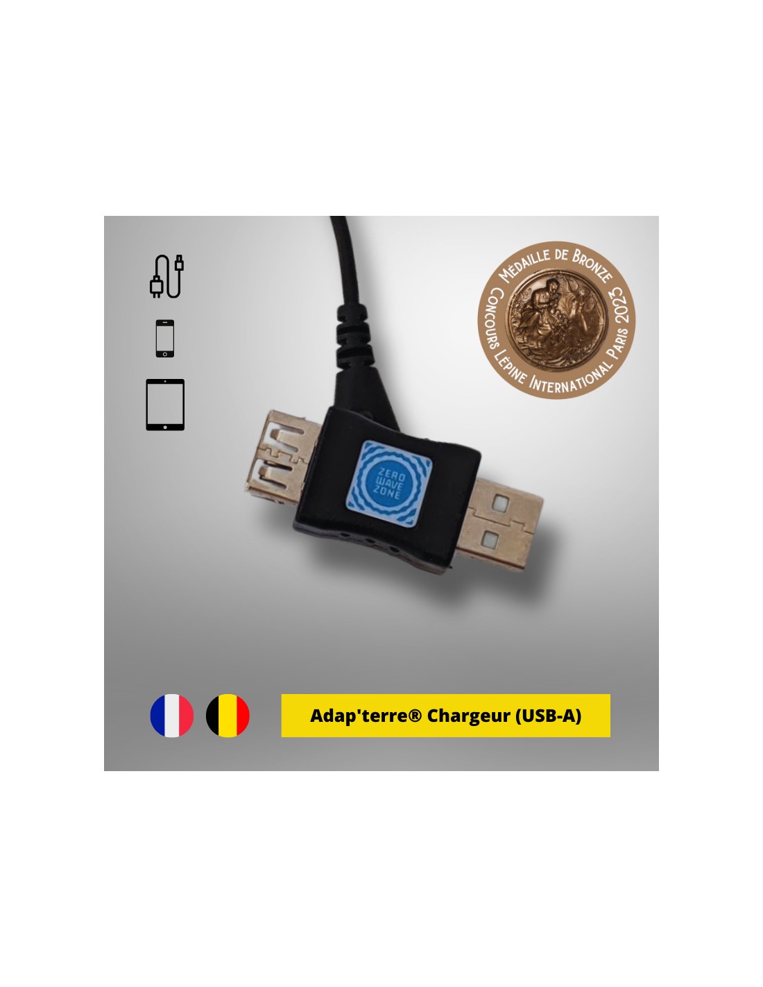 Cet adap'terre V2 permet de relier à la terre les chargeurs (USB-A) des téléphones portables pour supprimer la pollution électrique basses fréquences présente autour des téléphones en rechargement. La mise à la terre de l'adaptateur se fait par une patte métallique qui se fixe définitivement sur le chargeur et qui rentre en contact sur le «téton» de terre de la prise de courant ou d'une multiprise. Une fois en place, vous l'oubliez et êtes protégé sans plus avoir à y penser ! Ce système permet de brancher le bloc chargeur du téléphone et sa mise à la terre en même temps sur la prise, ce qui gagne en efficacité par rapport à la version précédente. Ce système a été récompensé d'une médaille de bronze au concours Lépine en 2023. Compatible avec toutes les prises de type E (France, Belgique, Pologne, Slovaquie, République tchèque)