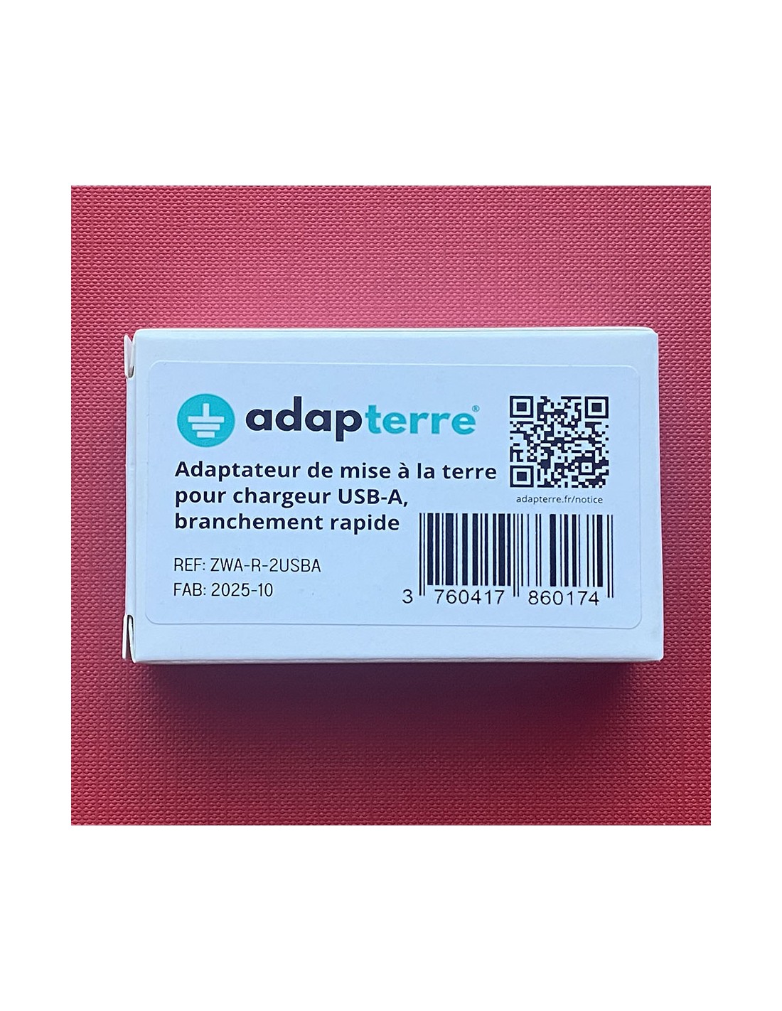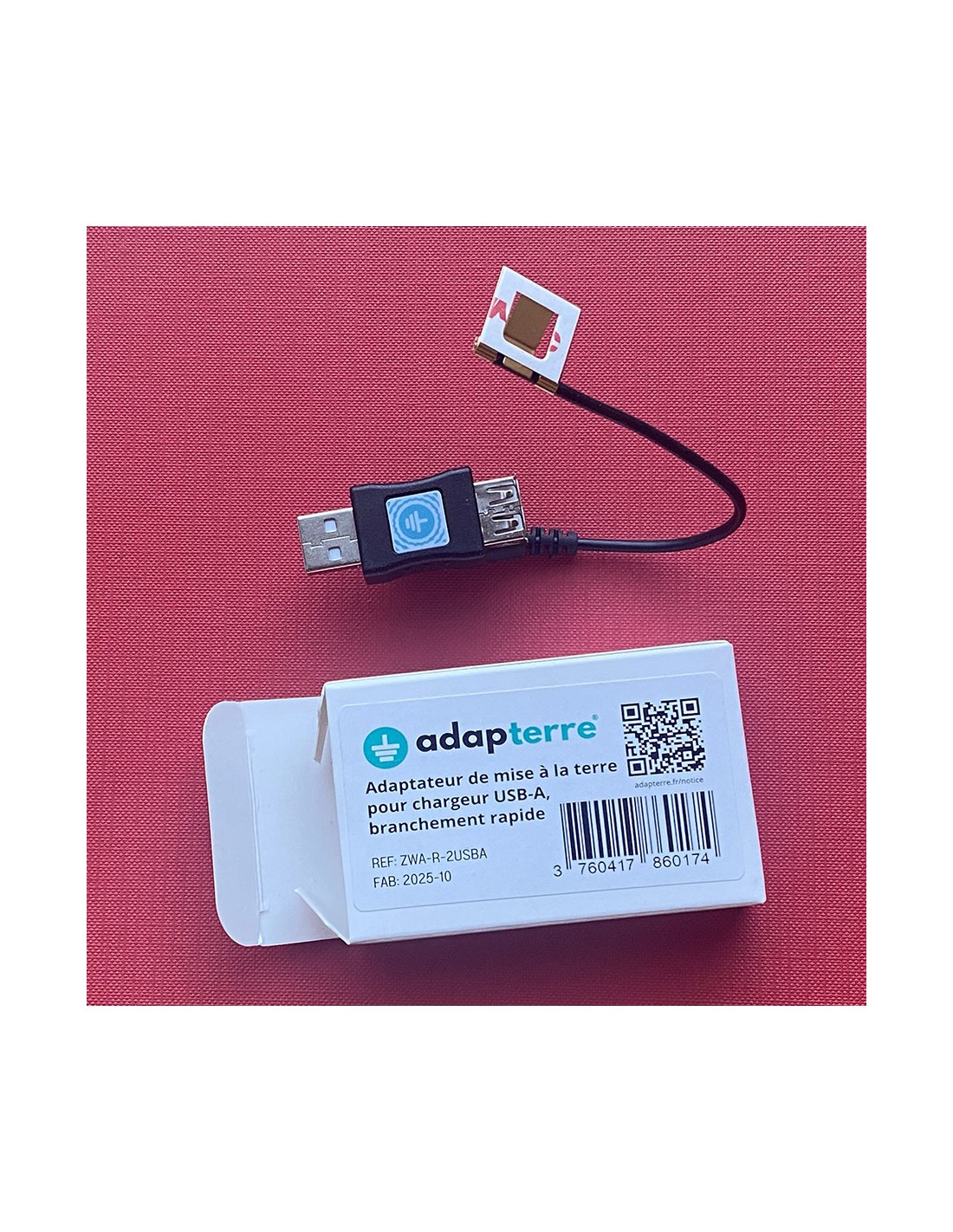 Il vous suffit de brancher l'adap'terre® côté USB-A mâle sur votre chargeur, votre câble USB-A de rechargement du téléphone sur le port USB-A femelle de l'adap'terre® et d'avoir préalablement fixé la languette de terre une fois pour toutes sur le chargeur grâce à son adhésif définitif, qui rentrera en contact du téton de terre d'une prise électrique (avec terre fonctionnelle aux normes électriques).