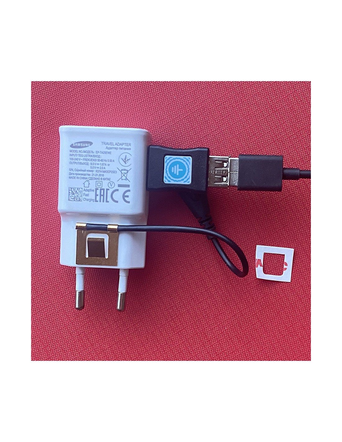 C'est un adaptateur USB-A mâle vers USB-A Femelle, qui comporte également un câble de mise à la terre à languette qui se fixe définitivement sur le chargeur et qui entre automatiquement en contact du "téton" de terre de la prise de courant ou multiprise de type E (France, Belgique, Pologne, Slovaquie, République tchèque). Ce câble est fixé par un bouton pression sur l'adaptateur.