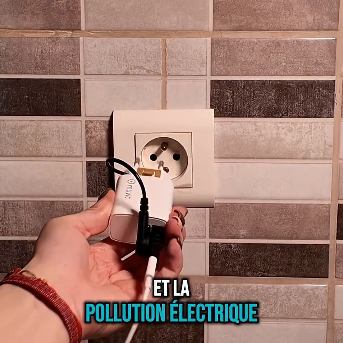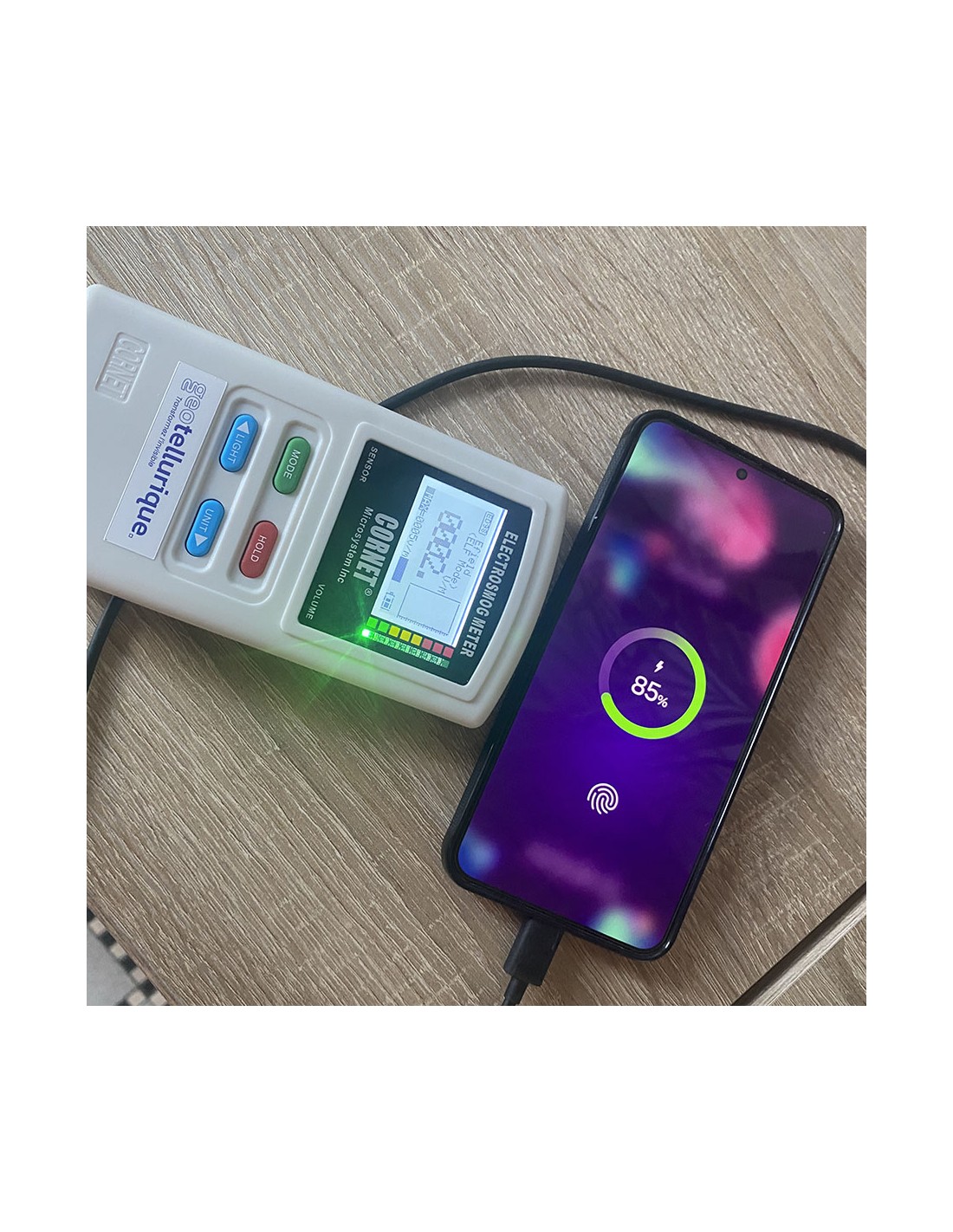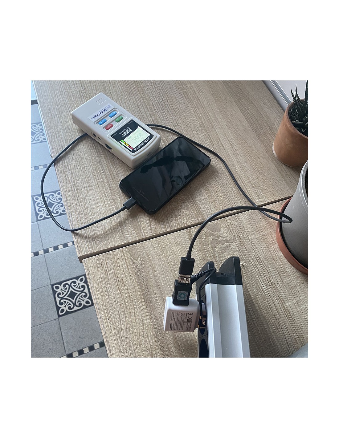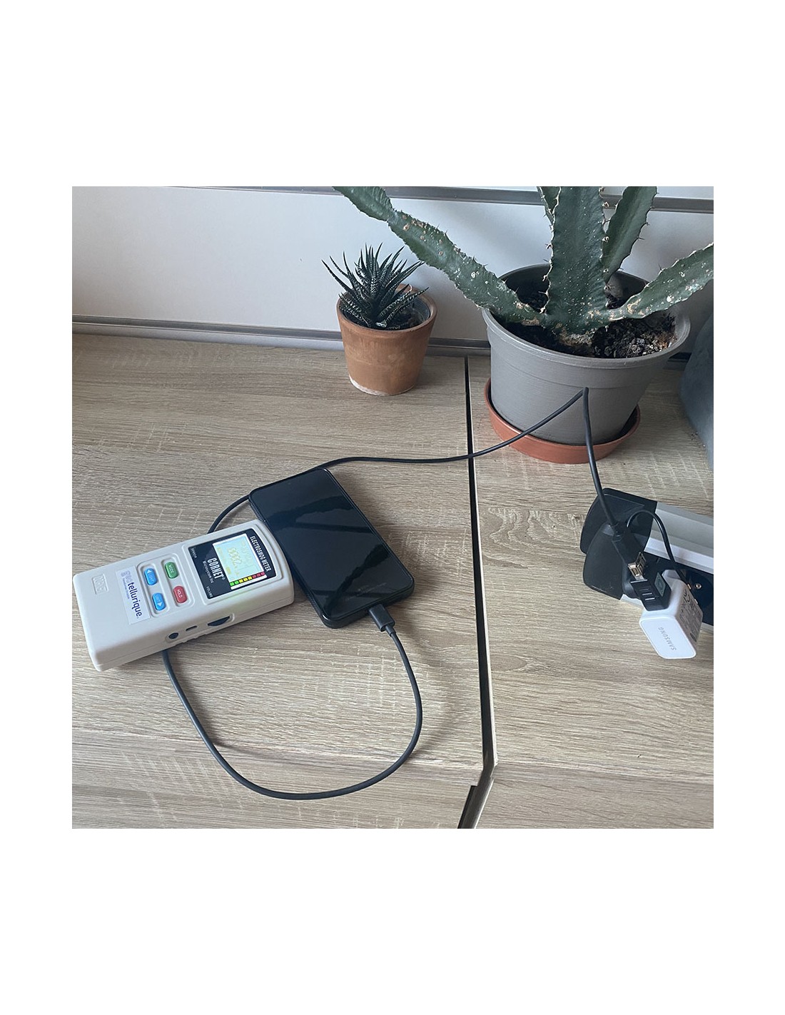 Pour vérifier l'efficacité du système, vous pouvez utiliser un testeur de champ électrique sonore ou un mesureur d'ondes afin de pouvoir mesurer et détecter les champs électriques 50/60Hz, que vous utiliserez le long du câble de chargement ou près du téléphone en recharge. Par exemple, il ne reste sur la photo ci-dessous du Cornet qui mesure à la fois ce qui vient de la prise, du chargeur, du câble et du smartphone branché "que" 3 V/m contre les 500 V/m et plus que l'on aurait mesuré au même endroit sans l'Adap'terre®.