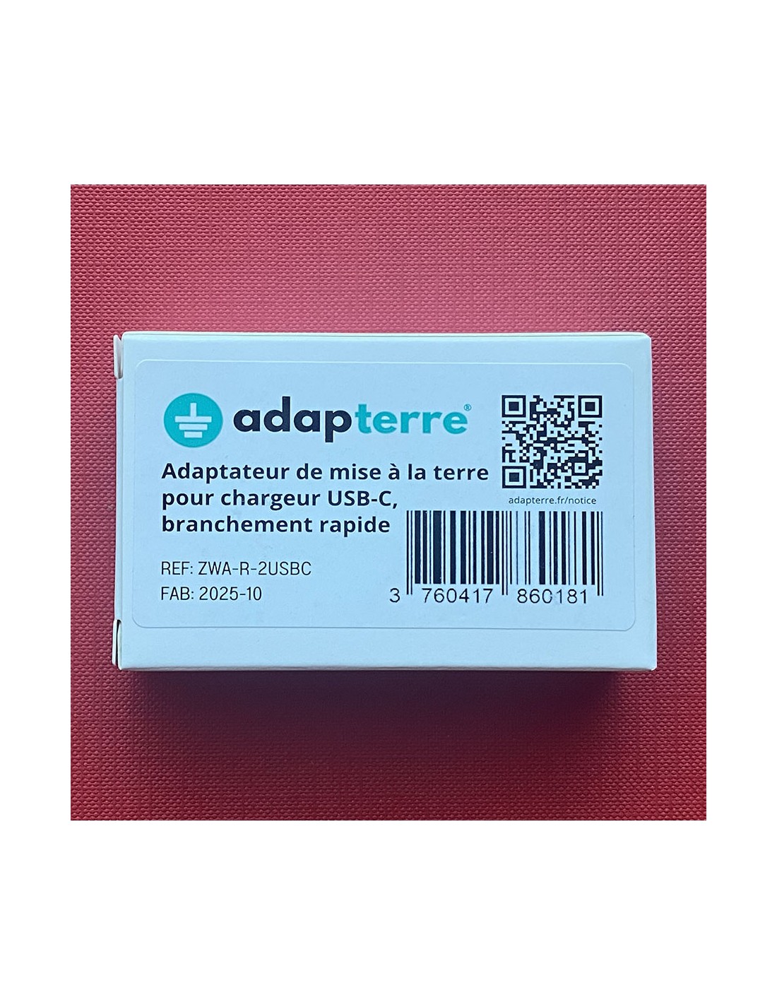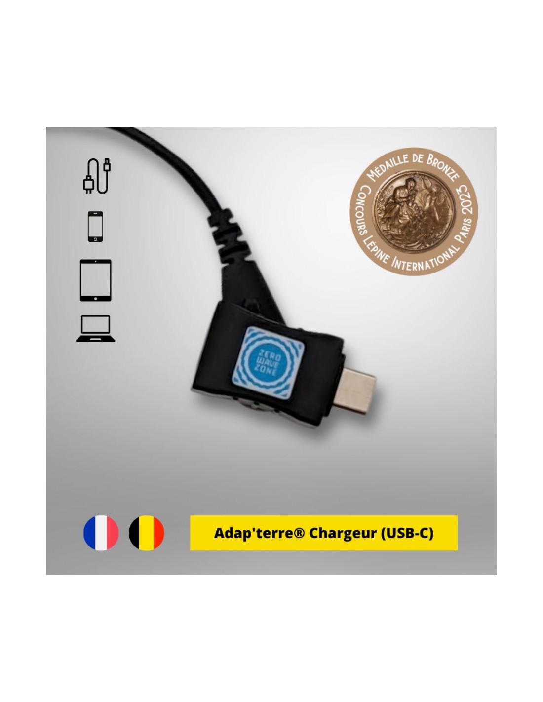 Ce système, nommé Adap'Terre (V2), a été récompensé d'une médaille de bronze au concours Lépine en 2023. Il permet de relier automatiquement à la terre les chargeurs rapides (USB-C) des téléphones portables, tablettes et ordinateurs, afin de neutraliser encore plus facilement les champs électriques de basse fréquence (50/60 Hz) pendant la charge, sans changer vos habitudes. La mise à la terre de l'adaptateur se fait par une patte métallique qui se fixe définitivement sur le chargeur et entre en contact avec le «téton» de terre de votre prise de courant ou de votre multiprise. Compatible avec toutes les prises de type E (France, Belgique, Pologne, Slovaquie, République tchèque).