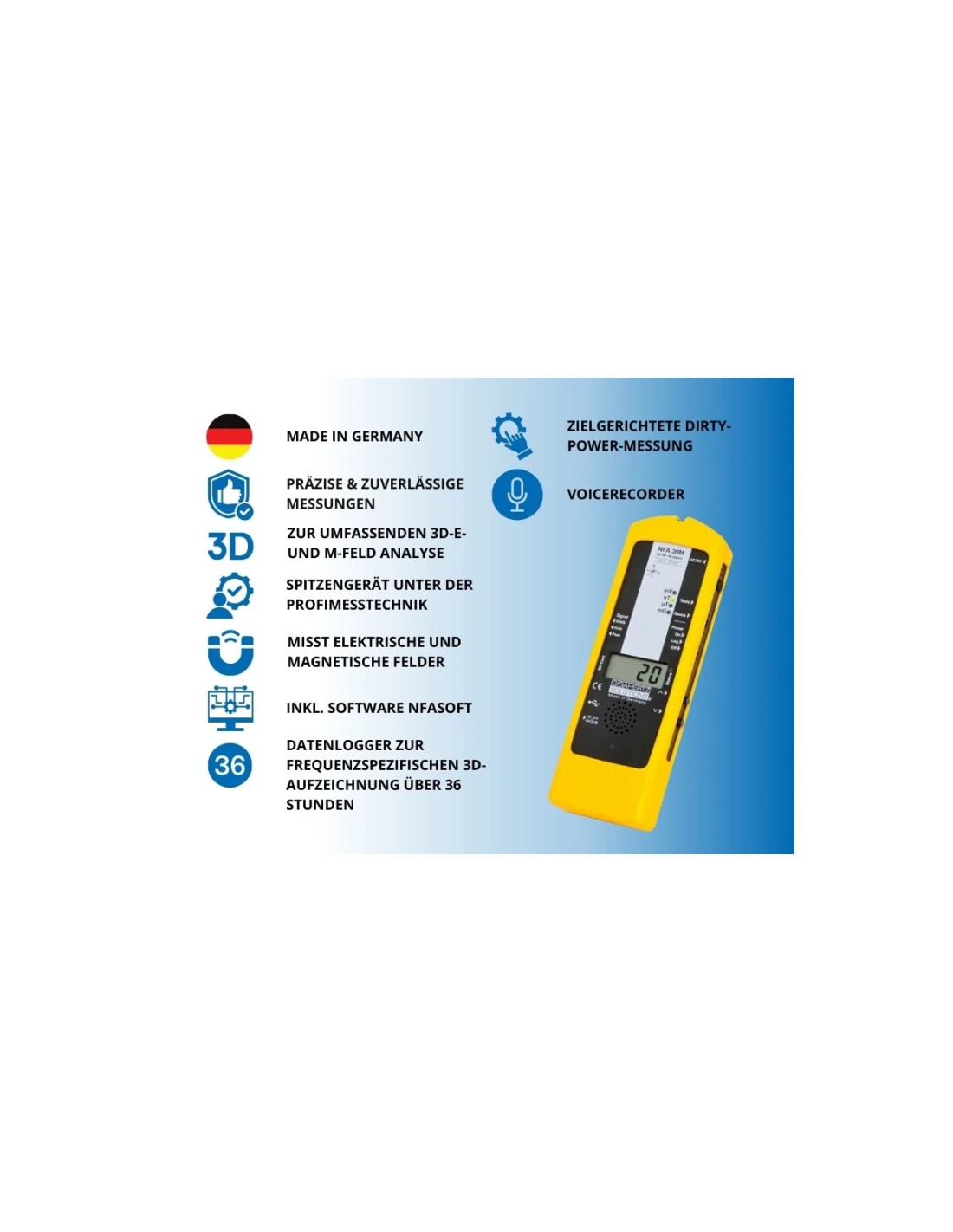 Le NFA1000 permet de gagner beaucoup de temps sur les mesures, en prenant des mesures en 3D sur tous les axes et toutes les directions. Equipé en standard du logiciel NFA Soft et d'une carte mémoire, il permet de faire des mesures professionnelles automatisées des mesures en 9 points sur un lit et des mesures en 6 points des postes de travail, selon les critères de la Baubiologie allemande. Ces mesures automatisées peuvent permettre de faire des diagrammes colorés des lieux analysés.