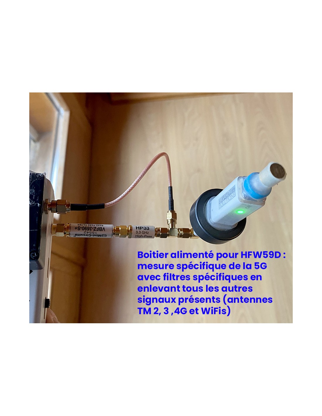 Ce kit permet d’alimenter l’antenne UBB2410 tout en utilisant des filtres non alimenté en DC, initialement prévu pour l’antenne LogPer. Ce kit est prévu pour être connecté directement à un HFW35C ou au HFW59D de Gigahertz Solutions. Très utile pour les mesures avec le filtre BP56 de chez Gigahertz Solutions pour mesurer les effets des WiFis à 5 Ghz, mais aussi pour mesurer la 5G de manière optimisée à l'aide d'un double filtre HP33 (ou HP33_G10) associé au VBFZ-3590-S+.