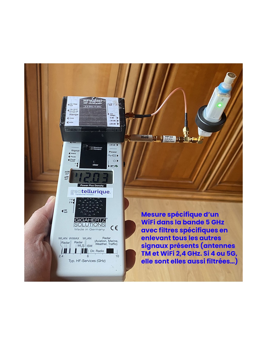 Le filtre BP56 de Gigahertz Solutions combiné à l’antenne UBB2410 permettra d'analyser spécifiquement la bande du WIFI dans la bande des 5GHz sans risque d'être perturbé par les autres fréquences, notamment celles de la 5G.