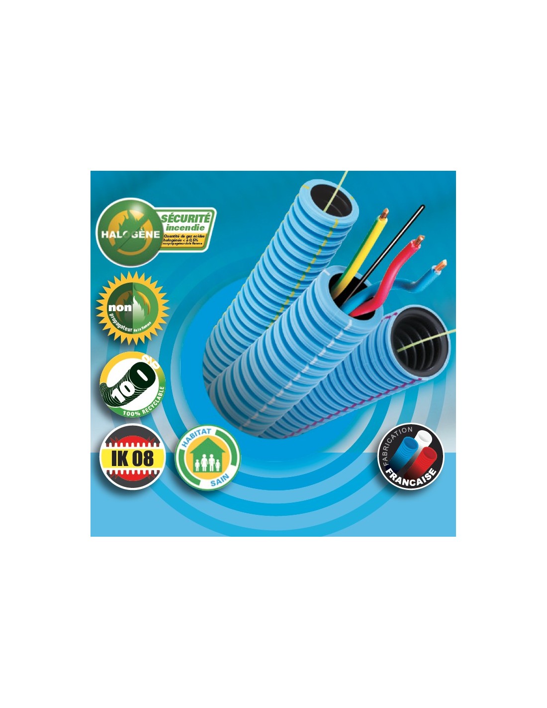 • La plupart de nos gaines électriques sont SECURITE INCENDIE : en cas de combustion, la quantité de gaz acides halogénés est inférieure à 0.5%