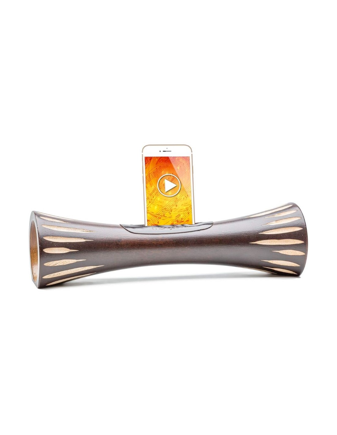 Le mangobeat agit comme un amplificateur en bois sans électricité. Insérez votre téléphone dans la cavité conçue à cet effet et laissez la résonance du bois naturel diffuser un son plus profond. Il amplifie naturellement le son du haut-parleur de votre smartphone, jusqu’à 5 à 8 fois plus intense. Les modèles 35 cm (Marron-Note, Wenge-Soleil, Naturel-Zèbre, Loupe) restituent des graves plus présents et conviennent parfaitement pour une expérience immersive, en intérieur ou extérieur.