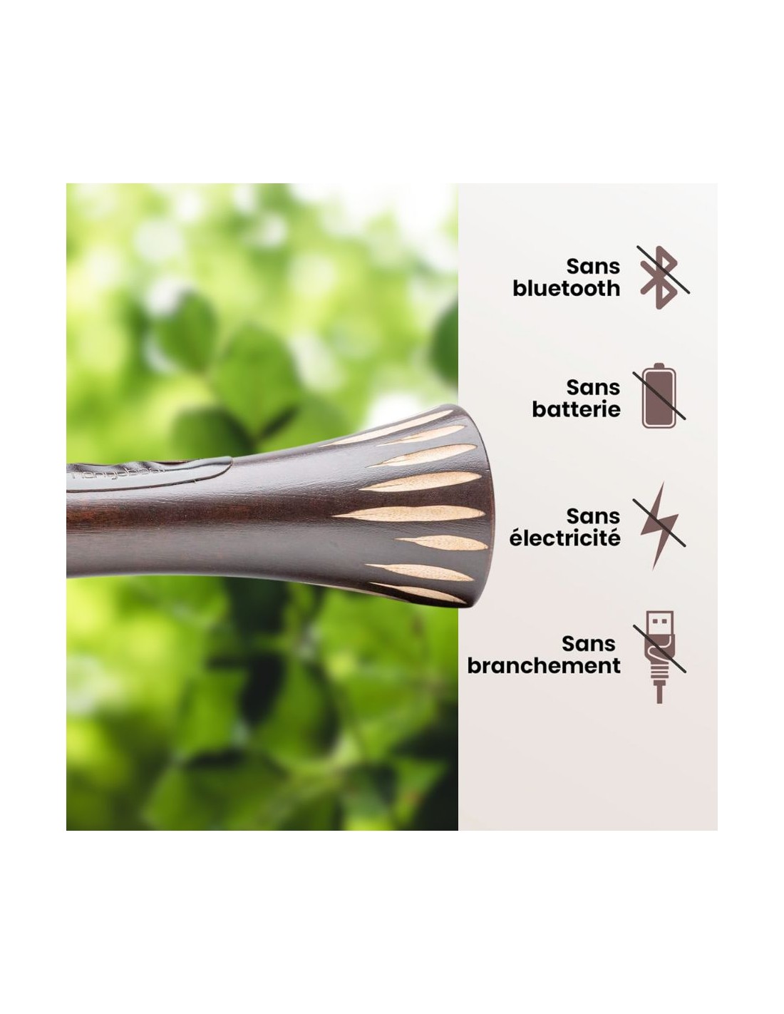 Découvrez l’enceinte Mangobeat en bois de manguier, entièrement passive et 100 % sans ondes. Elle fonctionne sans électricité, sans connexion Bluetooth ni Wi-Fi, et amplifie naturellement le son de votre smartphone grâce à la résonance du bois et à sa taille, qui favorise la diffusion de sons graves plus profonds. Primée quatre fois au concours lépine, cette enceinte passive écologique offre une expérience sonore unique, associée à un design élégant. De couleur marron wengé, motif soleil, et d'une longueur de 35 cm. La fente en cuir destinée à l’insertion du téléphone mesure 10 cm de large.