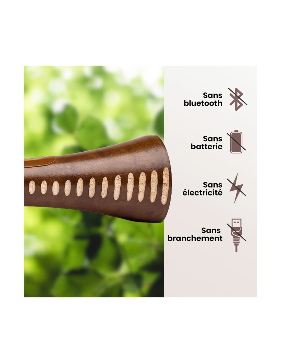 Découvrez l’enceinte Mangobeat en bois de manguier, entièrement passive et 100 % sans ondes. Elle fonctionne sans électricité, sans connexion Bluetooth ni Wi-Fi, et amplifie naturellement le son de votre smartphone grâce à la résonance du bois et à sa taille, qui favorise la diffusion de sons graves plus profonds. Primée quatre fois au concours lépine, cette enceinte passive écologique offre une expérience sonore unique, associée à un design élégant. De couleur marron, motif note, et d'une longueur de 35 cm. La fente en cuir destinée à l’insertion du téléphone mesure 10 cm de large.