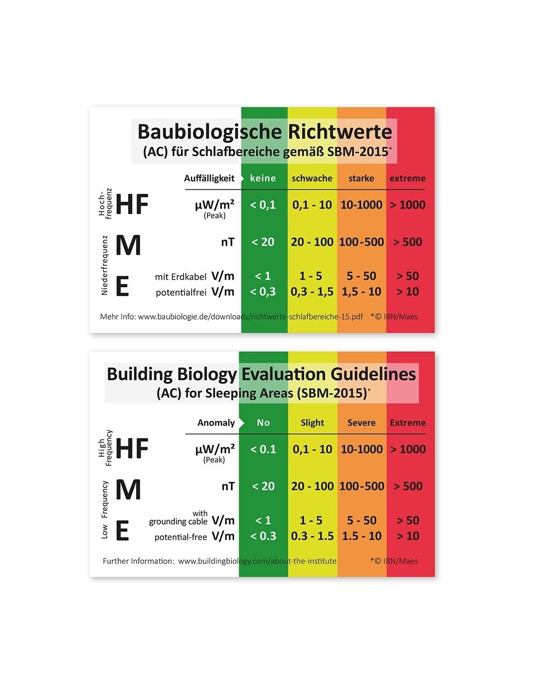 Fichier PDF : Valeurs indicatives (en anglais) en Baubiologie pour les zones de repos recommandées par les spécialistes de la biologie de l'habitat allemande (Baubiologie). Références 2024 qui remplacent celles de 2015. Ces références ont été mises à jour en 2024, mais n'existent à ce jour qu'en Anglais de manière officielle. Les changements étant sur des détails, nous laissons également au téléchargement le modèle 2015 en Français pour référence.