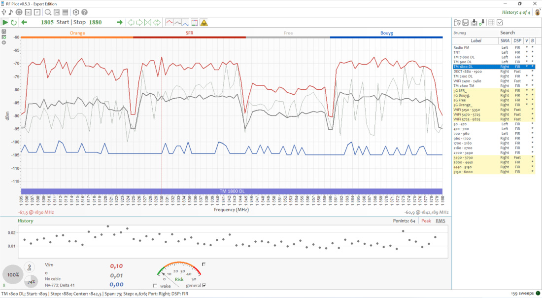 L'analyse spectrale effectuée de manière semi-automatisée avec notre analyseur de spectre RF Explorer 6G Combo+ Slim permet d'identifier les différentes fréquences utilisées et d'évaluer les puissances émises par chaque source, que ce soit celles de la téléphonie mobile, du WiFi, des téléphones d'intérieur ou babyphone DECT, etc… Notre logiciel est fourni avec un certain nombre de fréquences pré-programmées, afin de pouvoir être utilisé dès la fin de la formation adéquate nécessaire.