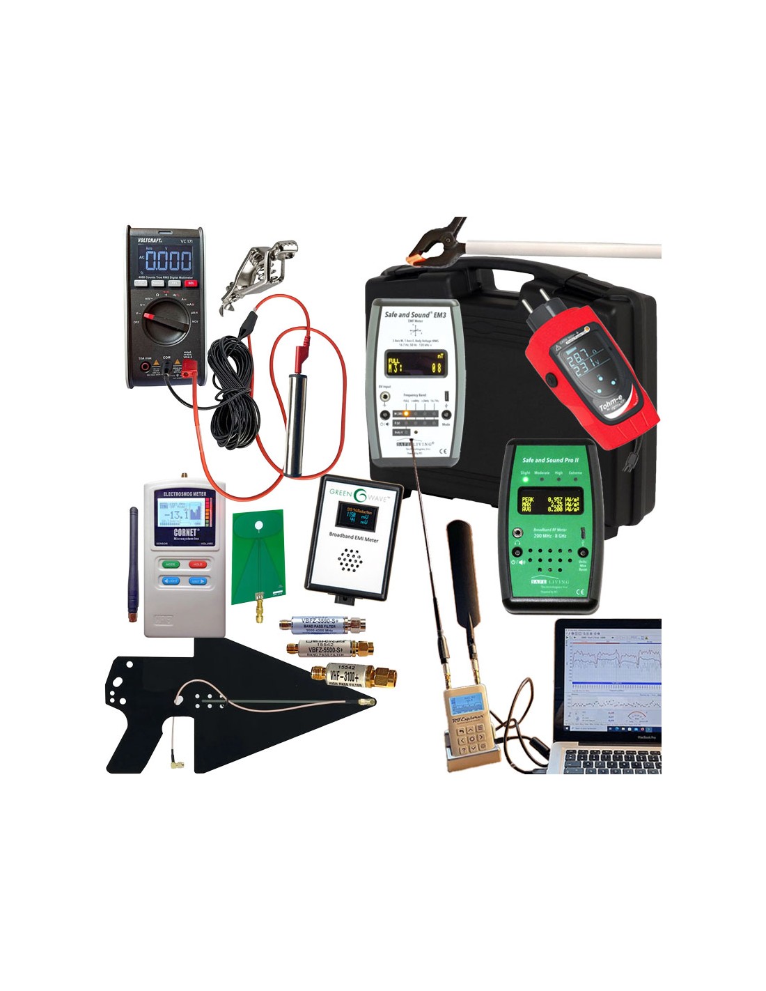 Un pack optimisé de mesures professionnelles "ProV4" Geotellurique.fr pour conseiller en environnement électromagnétique : pour les pros qui cherchent des appareils performants au rapport qualité-prix exemplaire : un acoustimètre Safe Living Technologies - Safe and Sound Pro II idéal pour des mesures de prévention HF jusqu'à 8 GHz, accompagné d'un Cornet ED85EXPlus5G avec connecteur universel SMA pour l'analyse directionnelle avec antenne dédiée, l'enregistrement sur la durée, un analyseur de spectre avec son pack d'antenneset sa formation incluant des logiciels dédiés permettant une analyse et quantification par types de sources, un mesureur de basses fréquences ultra-sensible et performant Safe & Sound EM3 (CE 1D - CM 3D avec filtres), l'excellent mesureur de terre Tohm-e, un Broadband EMI Meter pour l'électricité sale, et enfin un pack de tension induite pro.