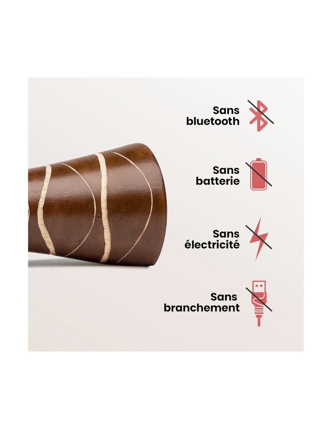 Le mangobeat agit comme un amplificateur en bois sans électricité. Insérez votre téléphone dans la cavité conçue à cet effet et laissez la résonance du bois naturel diffuser un son plus profond. Il amplifie naturellement le son du haut-parleur de votre smartphone, jusqu’à 5 à 8 fois plus intense. Les modèles 35 cm (Marron-Note, Wenge-Soleil, Naturel-Zèbre, Loupe) restituent des graves plus présents et conviennent parfaitement pour une expérience immersive, en intérieur ou extérieur.