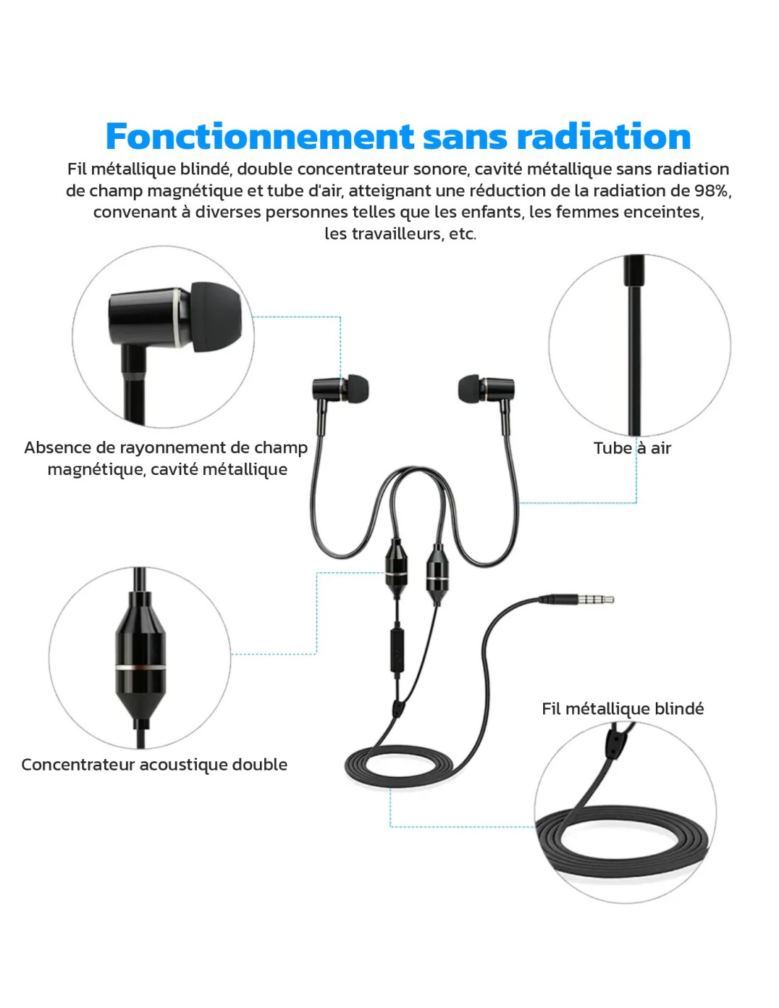 Les oreillettes iBrain à tube d’air neutralisent jusqu’à 98% des ondes électromagnétiques issues des téléphones portables, tout en offrant une bonne qualité sonore. Leur conception unique empêche la conduction des hautes fréquences via le fil, réduisant ainsi l’exposition aux ondes directement au niveau de l’oreille.