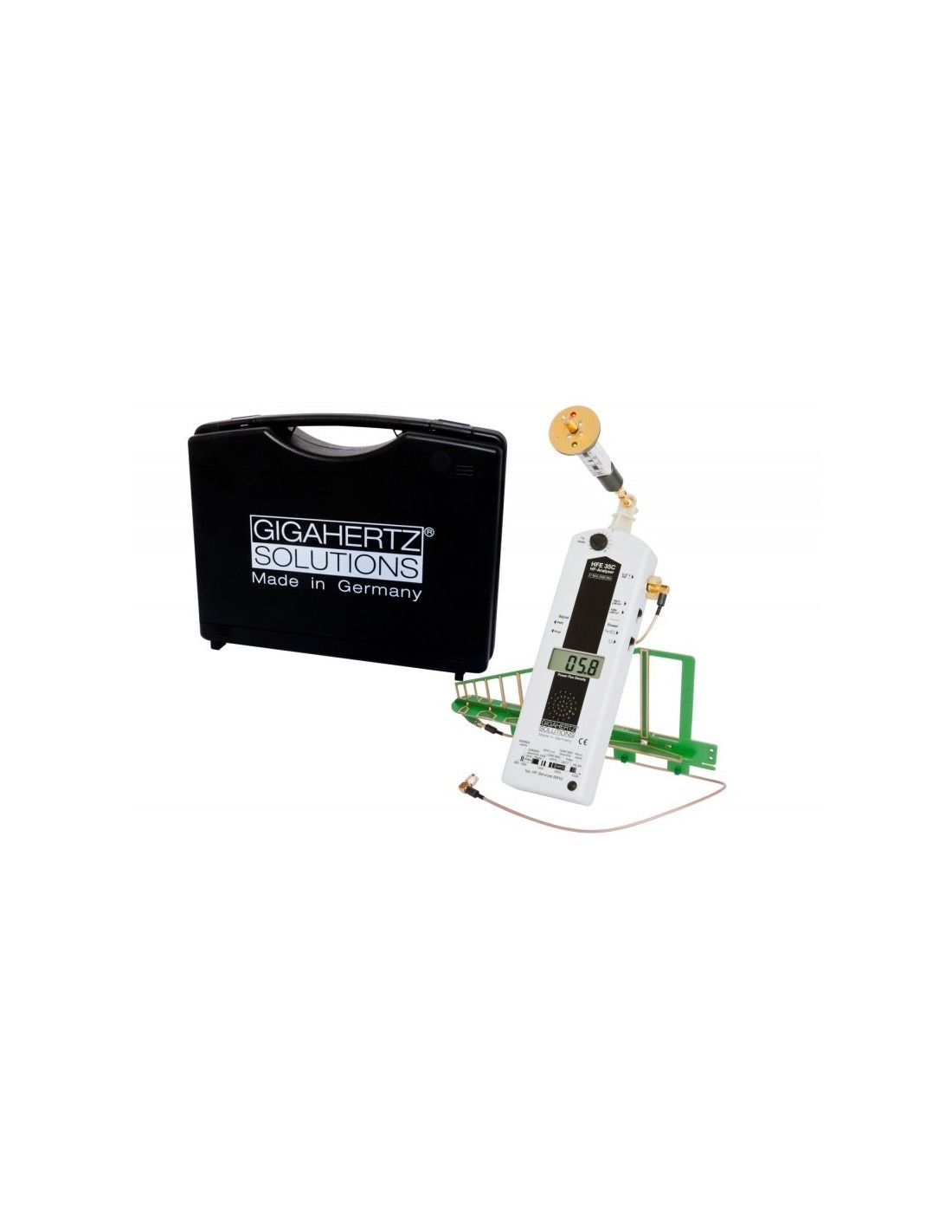 • Un mesureur de hautes fréquences Gigahertz Solutions HFE35C, fourni avec 2 antennes : UBB27, pour des mesures quasi-omnidirectionnelles, et LogPer pour déterminer avec précision les directions des différentes sources qui posent problème. Ces deux antennes compensées en fréquences, afin d'avoir des valeurs de mesures précises quelle que soient les fréquences mesurées, fonctionnent pour des fréquences données entre 27 MHz et 2,7 GHz. La très large gamme de fréquences comprend, entre autres, les services de téléphonie mobile comme le GSM (2G), l'UMTS/CDMA (3G), le LTE (4G), le 5G (bandes de fréquences étendues (700 MHz et future bande probable autour de 1500 MHz)), la bande inférieure des reseaux Wi-Fi sans fil (2,4 GHz), Bluetooth, TETRA/BOS, la télévision TNT, la radio (FM et RNT), et bien sûr aussi les "anciens" fours à micro-ondes et radios CB. Les fréquences inférieures radio des radars d'aviation sont également comprises. Fourni dans sa valise K5.