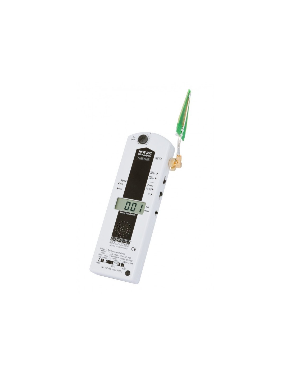 Le HFE35C dispose également d'une antenne directionnelle pour déterminer la direction des sources des principales antennes de téléphonie mobile. L'essentiel des perturbations à ce jour restent comprises dans les fréquences de cet appareil HFE35C. Les dernières générations de WiFis et les fréquences de la 5G ne seront pas couvertes par le HFE35C, et nécessiteront l'emploi du HFW35C en complément pour des mesures spécifiques. Le HFE35C comme le HFW35C permet aussi de faire la différentiation entre les ondes pulsées et non pulsées, grâce à un interrupteur permettant de choisir entre toutes les ondes et celles pulsées uniquement.