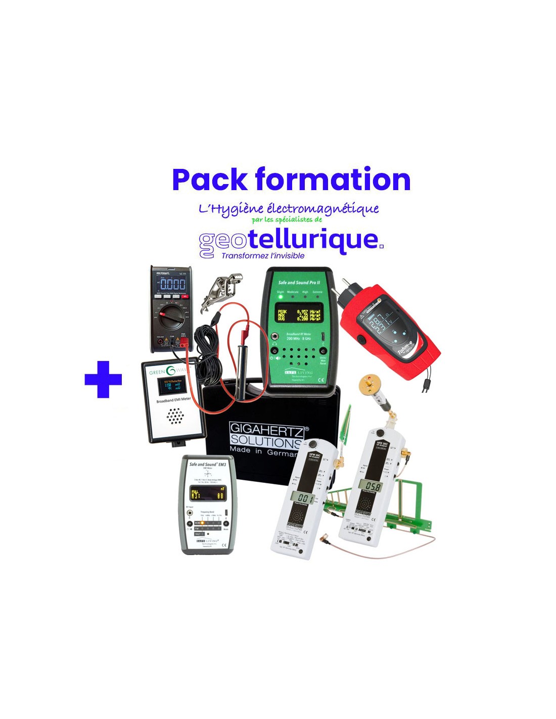 Ce pack "V3+" comprend tout ce qu'il faut pour un géobiologue spécialiste voulant s'équiper de matériel professionnel au meilleur rapport qualité-prix. Il permet de mesurer l'ensemble des perturbations des ondes électromagnétiques sur une gamme extrêmement large de fréquences, avec un appareil dédié à chaque source à mesurer (hautes et basses fréquences, ainsi que pour la problématique de l'électricité sale liée notamment à l'installation des compteurs Linky). Ce pack étend les fréquences mesurées de 27 MHz à 8 GHz, avec 2 appareils spécifiques HF de chez Gigahertz Solutions, dont le HFE35C avec 2 antennes (omni et directionnelle) pour valider s'il y a des fréquences de FM, non mesurées par le Safe & Sound Pro 2.